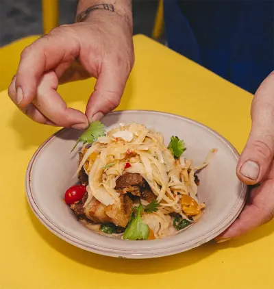 Sa plus grande inspiration? Les rues brûlantes d’Asie du Sud-Est, le funk sucré de la sauce de poisson, l’acidité de la papaye verte, le choc du piment. Un mélange vibrant de chaleur colombienne et de générosité asiatique.